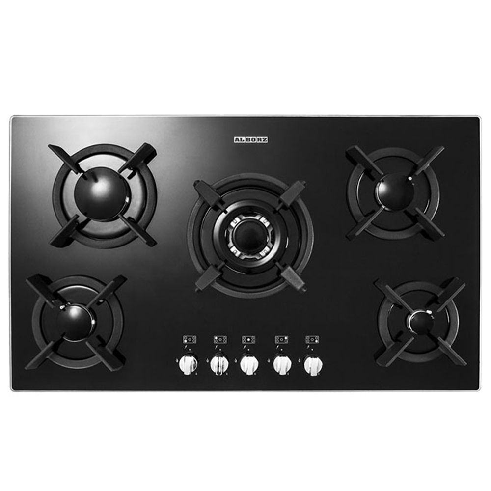 گاز استیل البرز مدل G 5904 نمای شیشه سکوریت مشکی مقاوم در برابر حرارت و ضربه و ابعاد 86 * 50 سانتی متر با قطعات ایتالیایی ( سرشعله ، جرقه زن ، ترموکوبل ، ولوم ) با کیفیت و خدمات پس از فروش در سراسر کشور