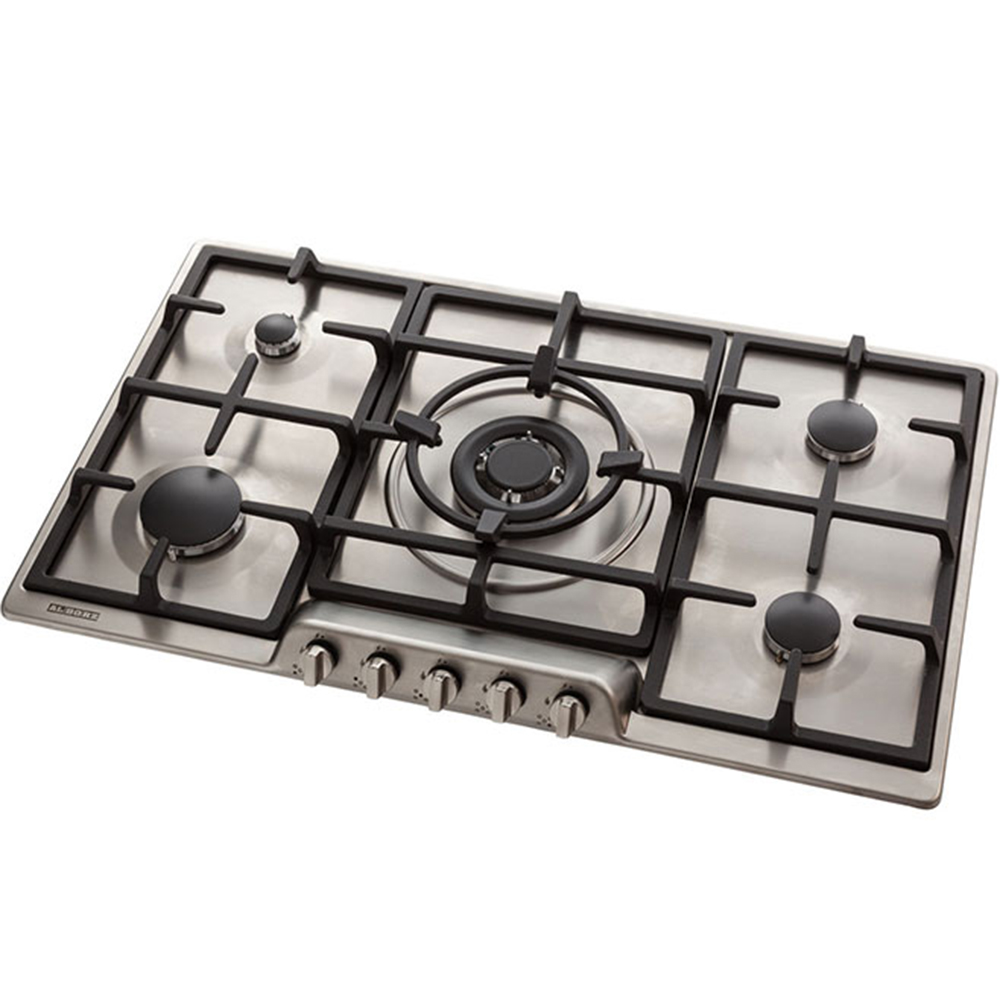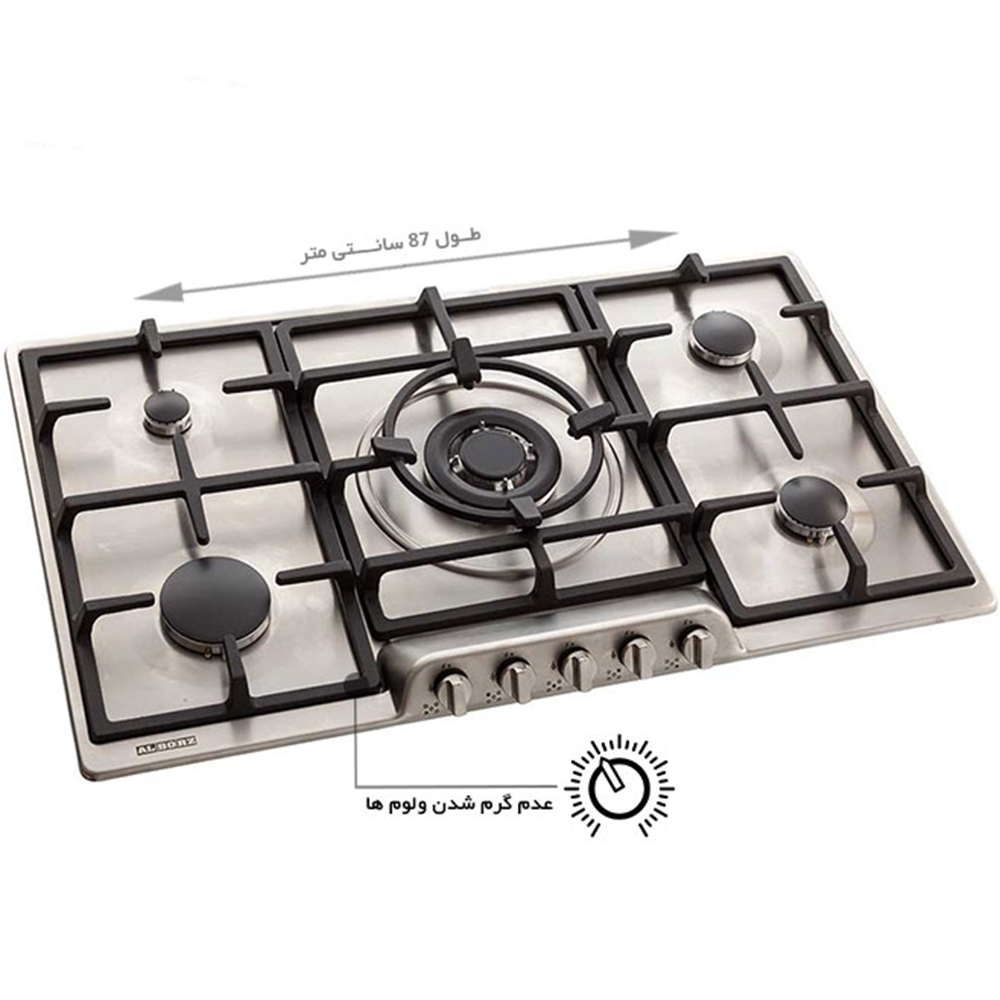 گاز استیل البرز مدل S 5907 دارای پنج شعله و پلوپز وسط میباشد اکثر قطعات اصلی این اجاق گاز رومیزی ساخت ایتالیا میباشد. طراحی این اجاق گاز به نحوی هست که مانع از داغ شدن ولوم ها میگردد