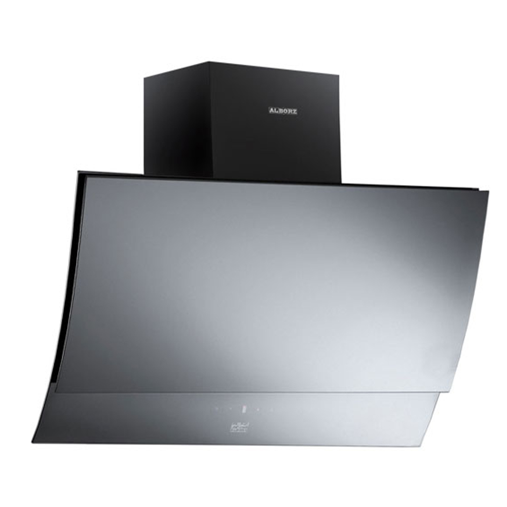 هود استیل البرز مدل Sa 432 دارای نمای درب شیشه ای منحنی سکوریت ( مقاوم در برابر حرارت ) به سمت داخل و سایز 85 سانتی متر با قابلیت نصب در سایز 85 – 90 سانتی متری