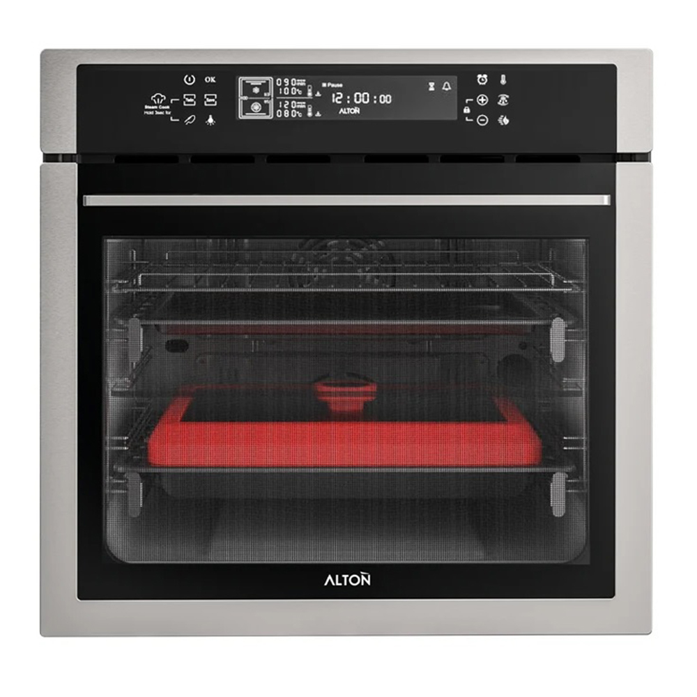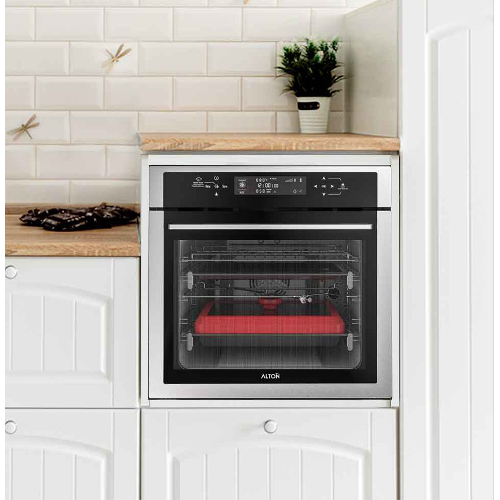 فر توکار آلتون V500TS برقی این فر دارای نمای شیشه و استیل و حجم داخلی 72 لیتر و درب 4 جداره جداشونده و صفحه نمایشگر دیجیتال لمسی و 19 برنامه پخت و سیستم پخت سریع و ذخیره برنامه دلخواه و قفل کودک و تایمر پیشرفته پخت و برنامه یخ زدایی و فن گردش هوای داغ و فن خنک کننده اتوماتیک و ریل تلسکوپی . از ویژگی های این محصول میتوان به دوقلو بودن این دستگاه به همراه قابلیت بخار پز نمودن اشاره نمود