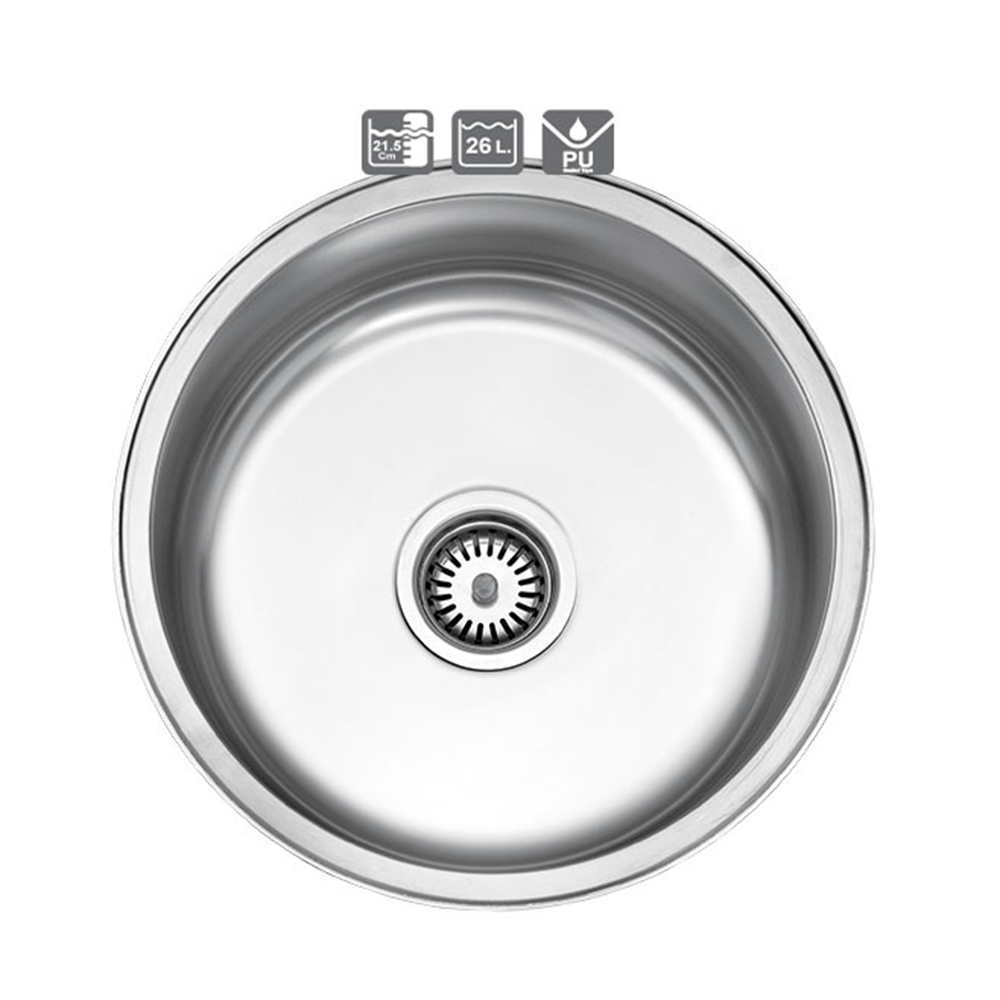 سینک استیل البرز 170 توکار با ابعاد 46*46 سانتی متر با طراحی دایره ای و سیفون بزرگ با امکان تخلیه فوری به همراه تفاله گیر
