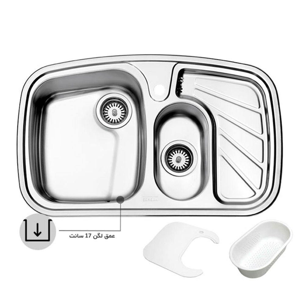 سینک استیل البرز 608 توکار دارای ابعاد 80*50 سانتی متر این محصول دارای یک سینی ، یک میوه شور و یک لگن بزرگ میباشد با عمق لگن 17 سانت